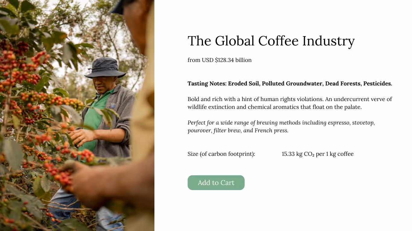 Like the rest of the broken food system, coffee production claims a devastating toll on the environment. And ICYMI: the coffee trade is built on centuries of slave labour. One look at history will tell you all you need to know. Beyond that, modern-day investigations continue to reveal the systemic predatory practices the industry employs to trap millions of domestic workers and smallholder farmers in perpetual cycles of poverty and violence.