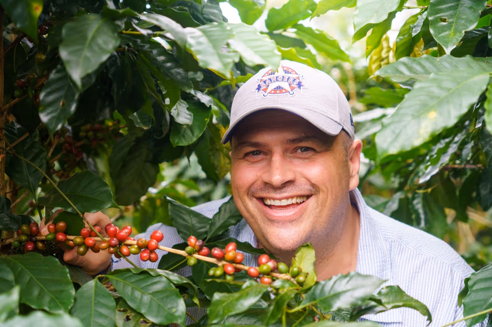 Source: Hülsen, Kasper. Kasper Hülsen smiling with coffee cherries at Slow’s agroforest farm in Laos.