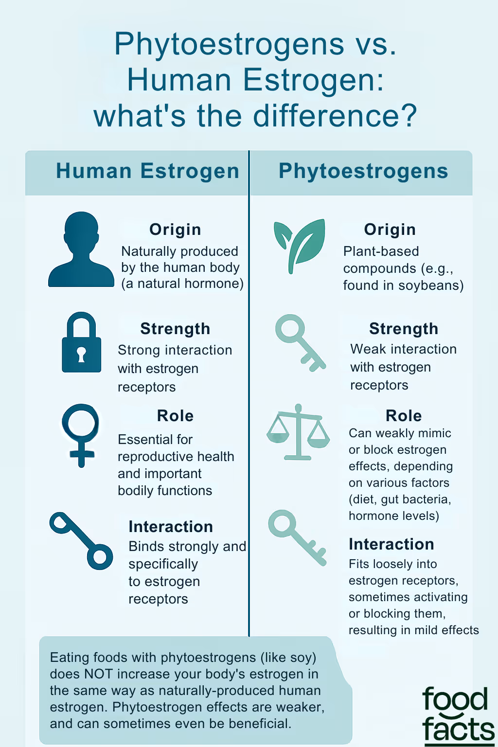 So, while phytoestrogens and human estrogen can both interact with the same receptors, they are not the same and do not have the same strength or effects in the body.