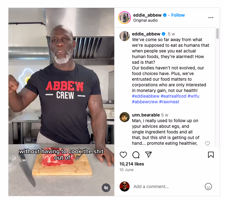 In this video, raw meat appears to be the epitome of what Eddie Abbew calls “real” food, food that he claims is designed for human consumption, in contrast with any form of processed products, which he regularly criticises. Within this perspective, the polar opposite would probably be ultra-processed, plant-based meat. Interestingly, in a later video posted just a few days later, Eddie Abbew warns his audience about the dangers of Quorn products, citing the tragic story of a young boy who died after suffering from a severe allergic reaction — which is an immune response, not the same as an infection caused by bacteria in food. The implication is clear: natural, unprocessed food like raw meat is safe; foods made in a factory are not.