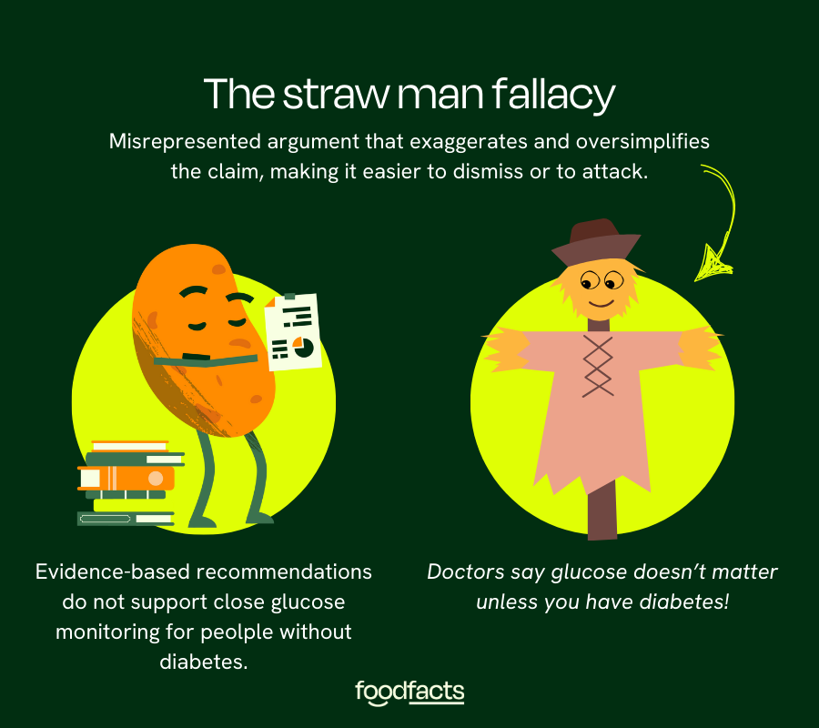 This distinction matters, because the analogy sets up a straw man. The straw man fallacy works as a distraction: while listeners are drawn to what feels like a reasonable conclusion (glucose management matters to prevent diabetes), attention is pulled away from the real premise. By subtly rephrasing doctors’ position, the analogy makes it easier to refute, presenting an appealing but misleading critique of medical advice.